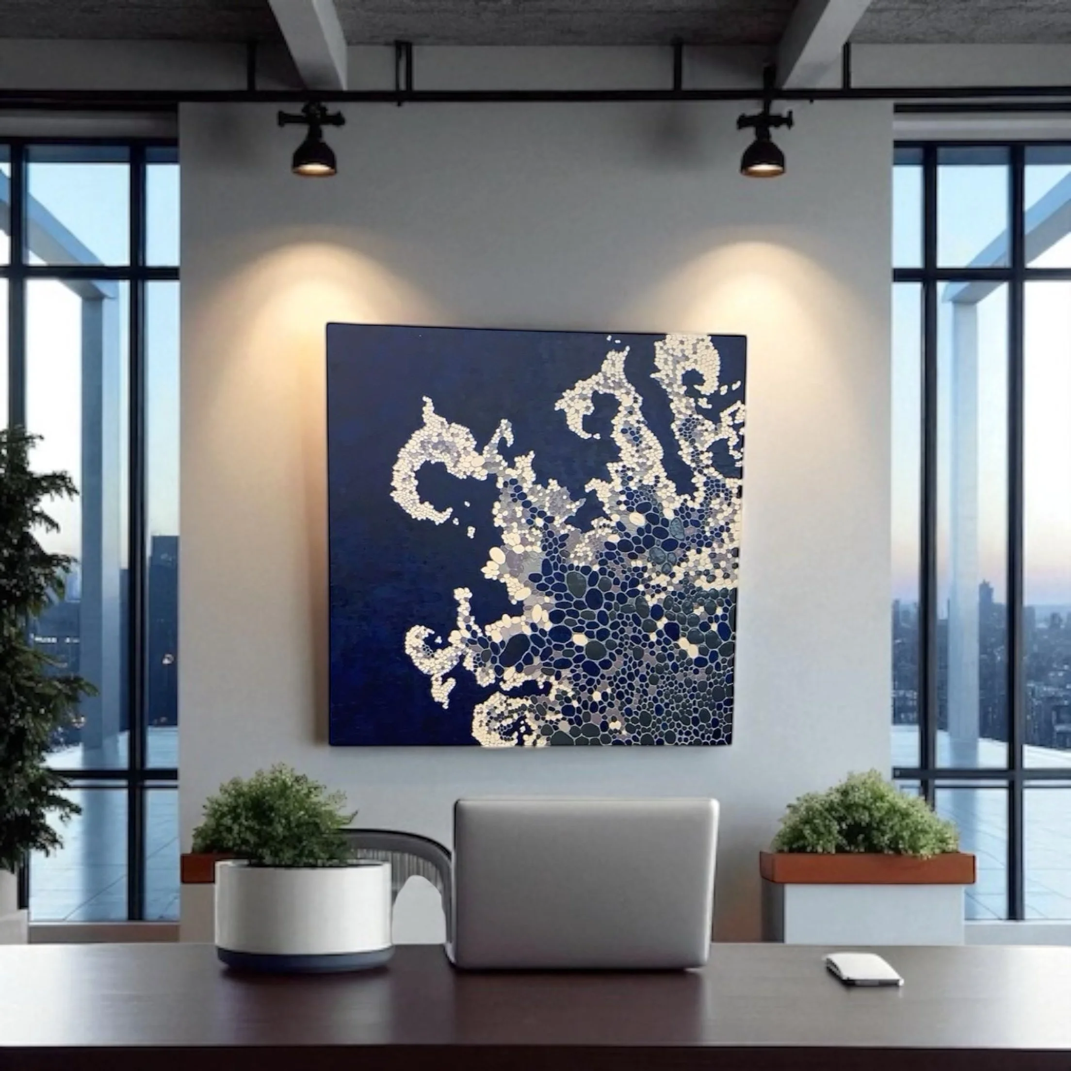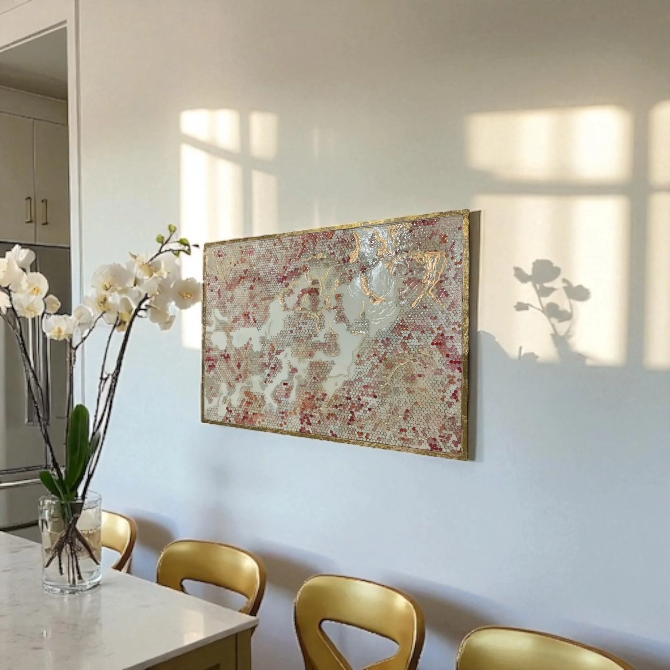 Using Golden acrylic paints as her medium of choice, Rachel builds her compositions with layers of molding pastes, gels, and glazes to create multi-dimensional works that captivate the viewer's eye. Her Honeycomb Series reflects a fascinating blend of chaos and order, inspired by the busy bee mentality, yet infused with moments of calm and balance. Each piece invites you to explore texture, depth, and color in a way that feels both playful and purposeful.